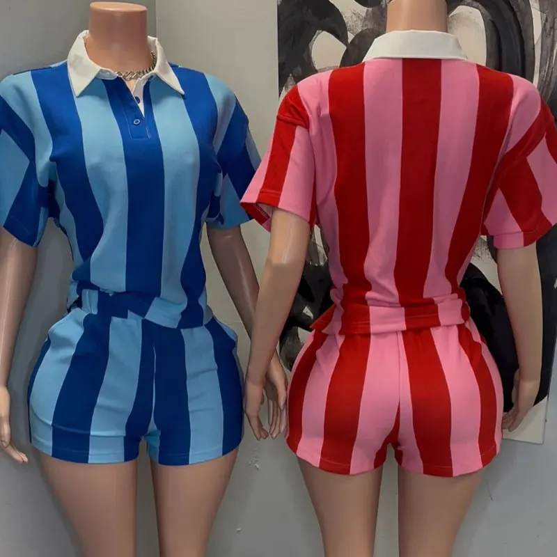 Huili Stripe Short Sleeve Polo Shirt & Shorts Gym Sportswear 2025 Cotton Loungewear Custom logo Two Piece Set Tracksuit Women
